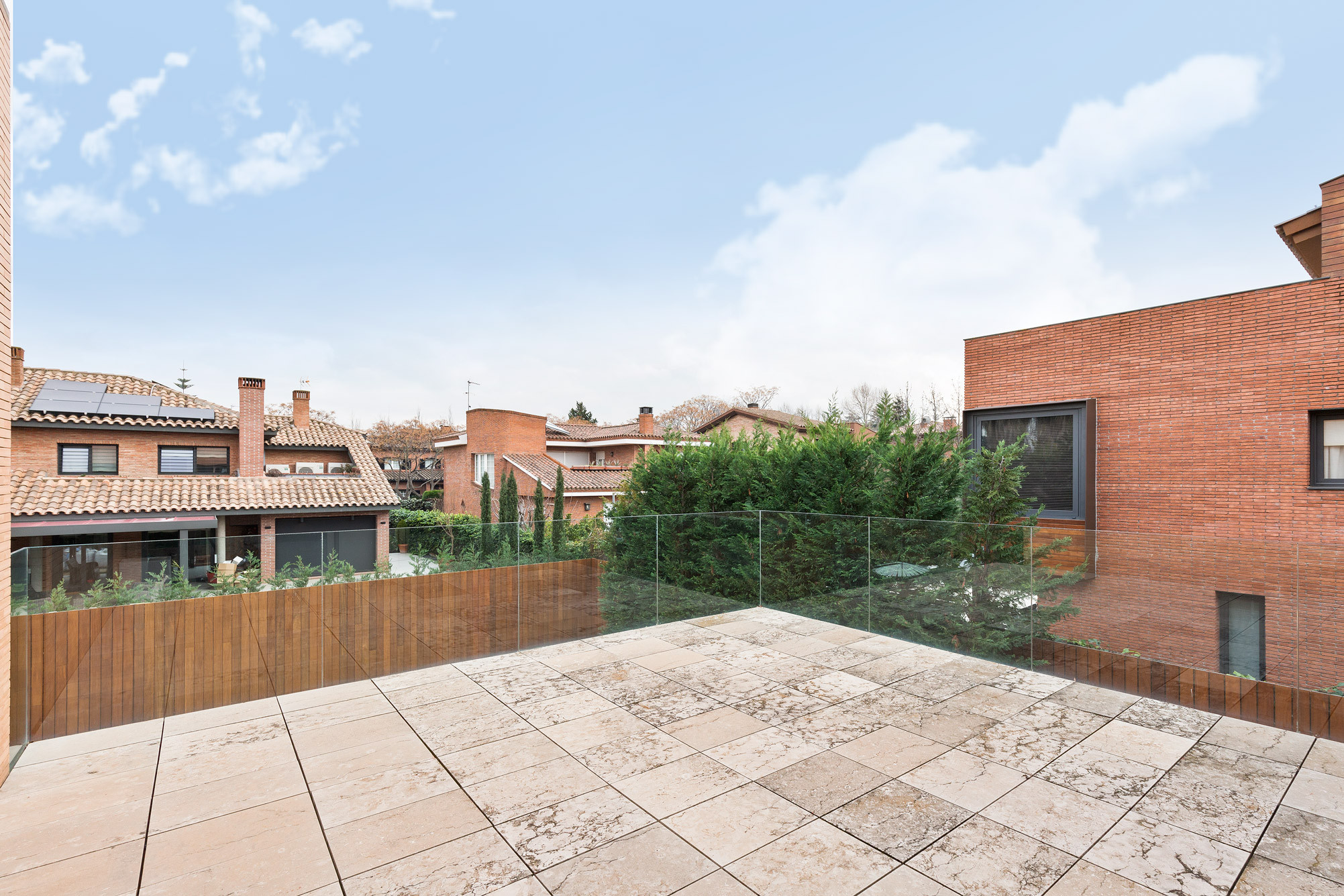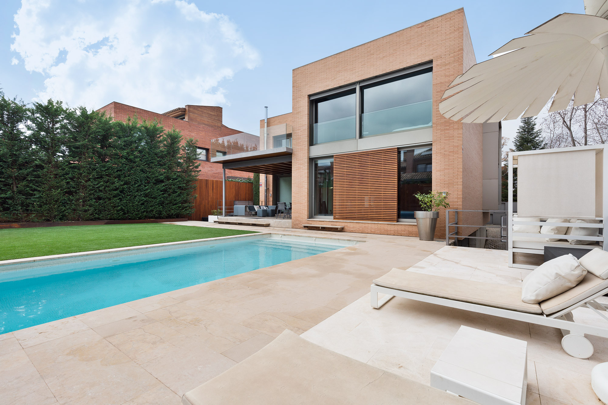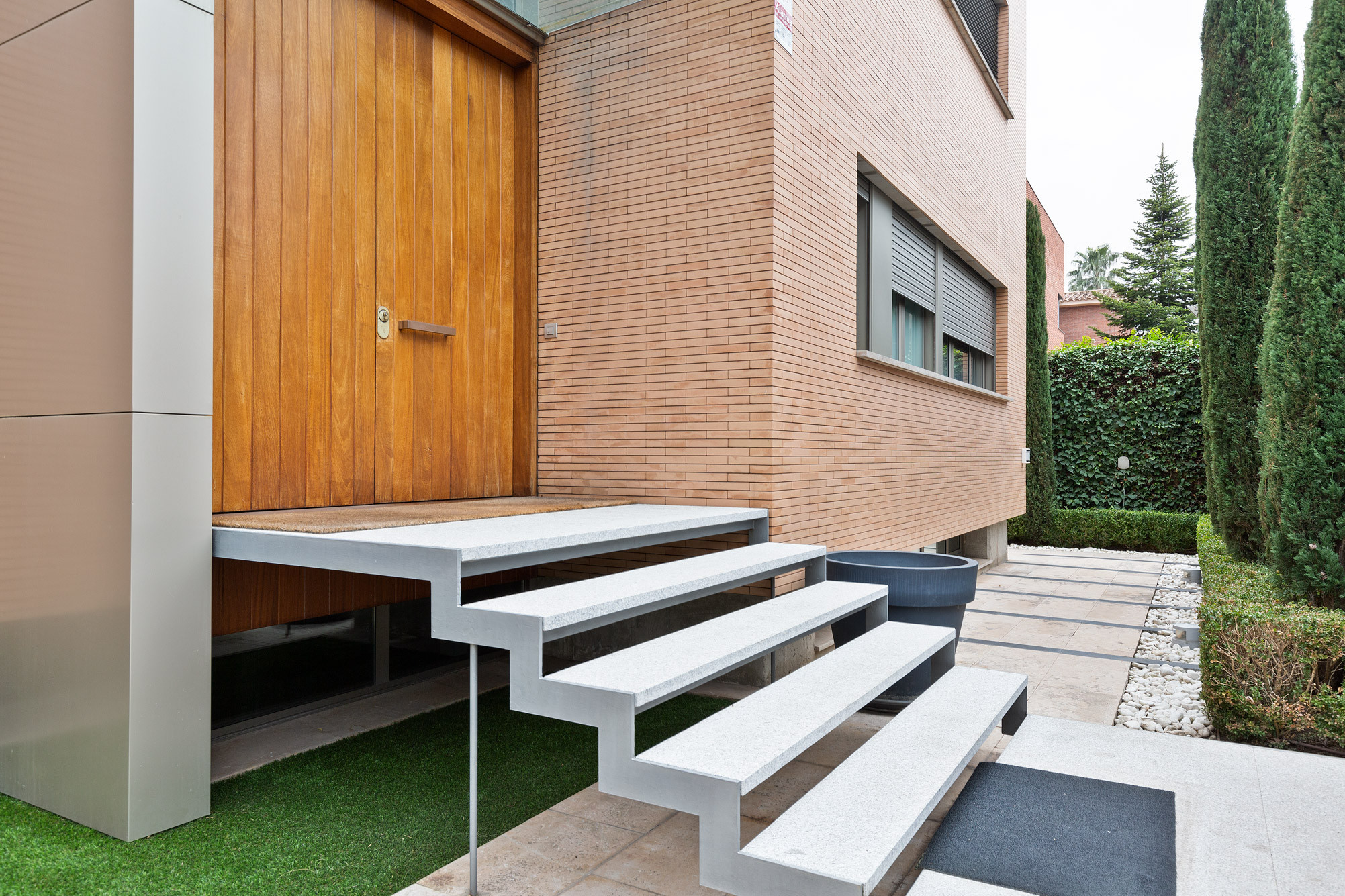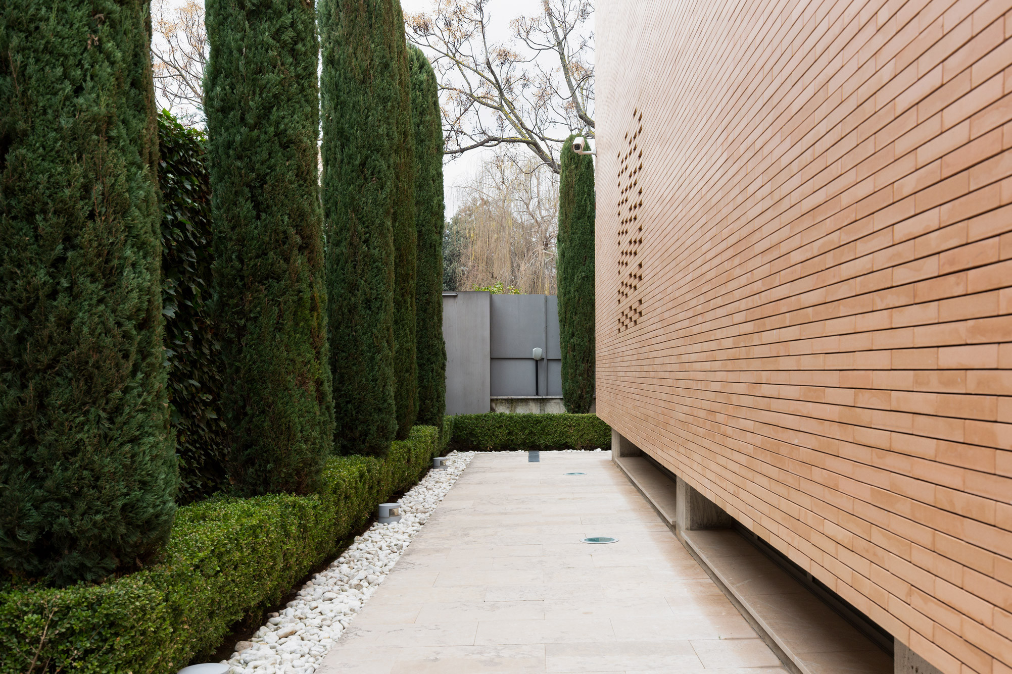 - Fachada cúbica de ladrillo macizo de cara vista, diseñada a cuatro vientos.