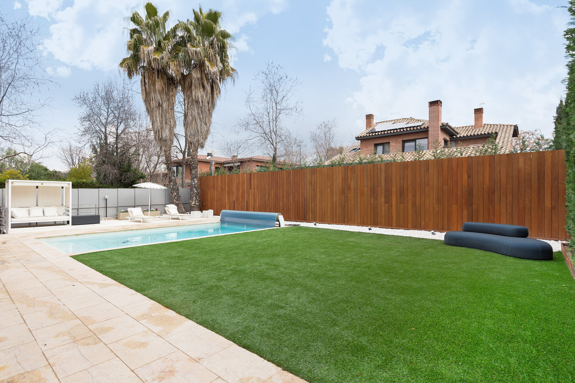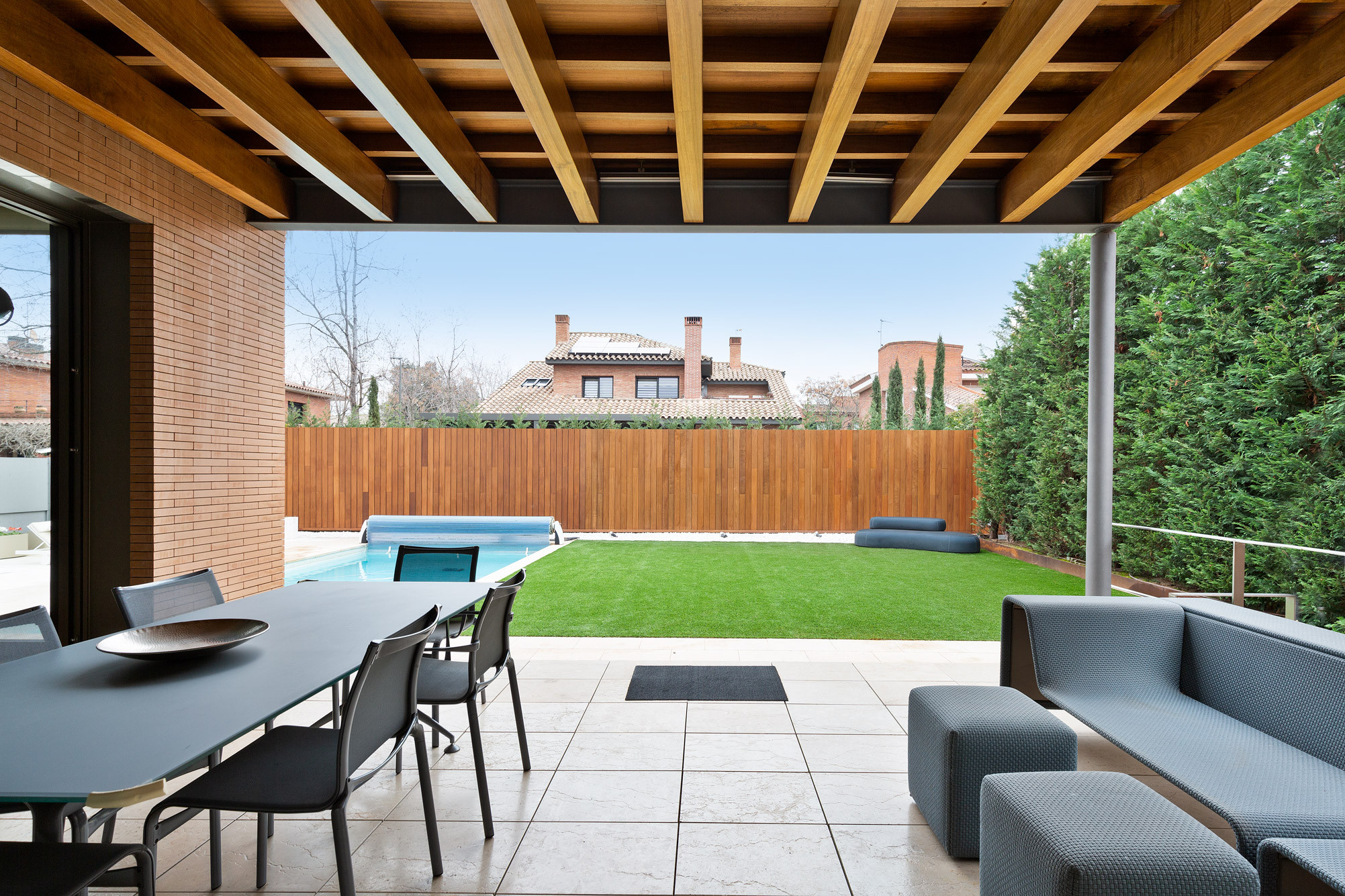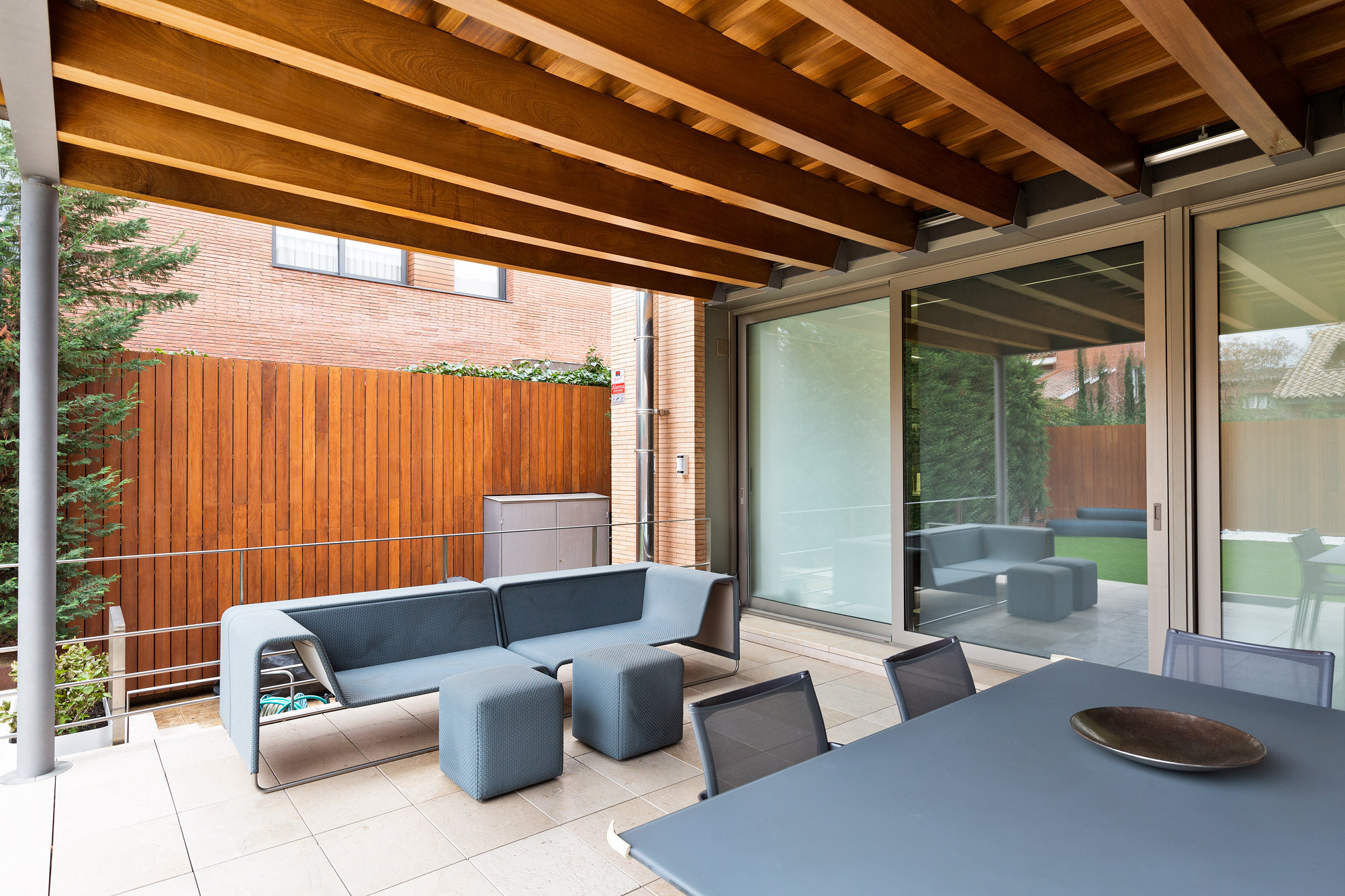 - Porche de madera como antesala del jardín privado, ideal para disfrutar del entorno natural.