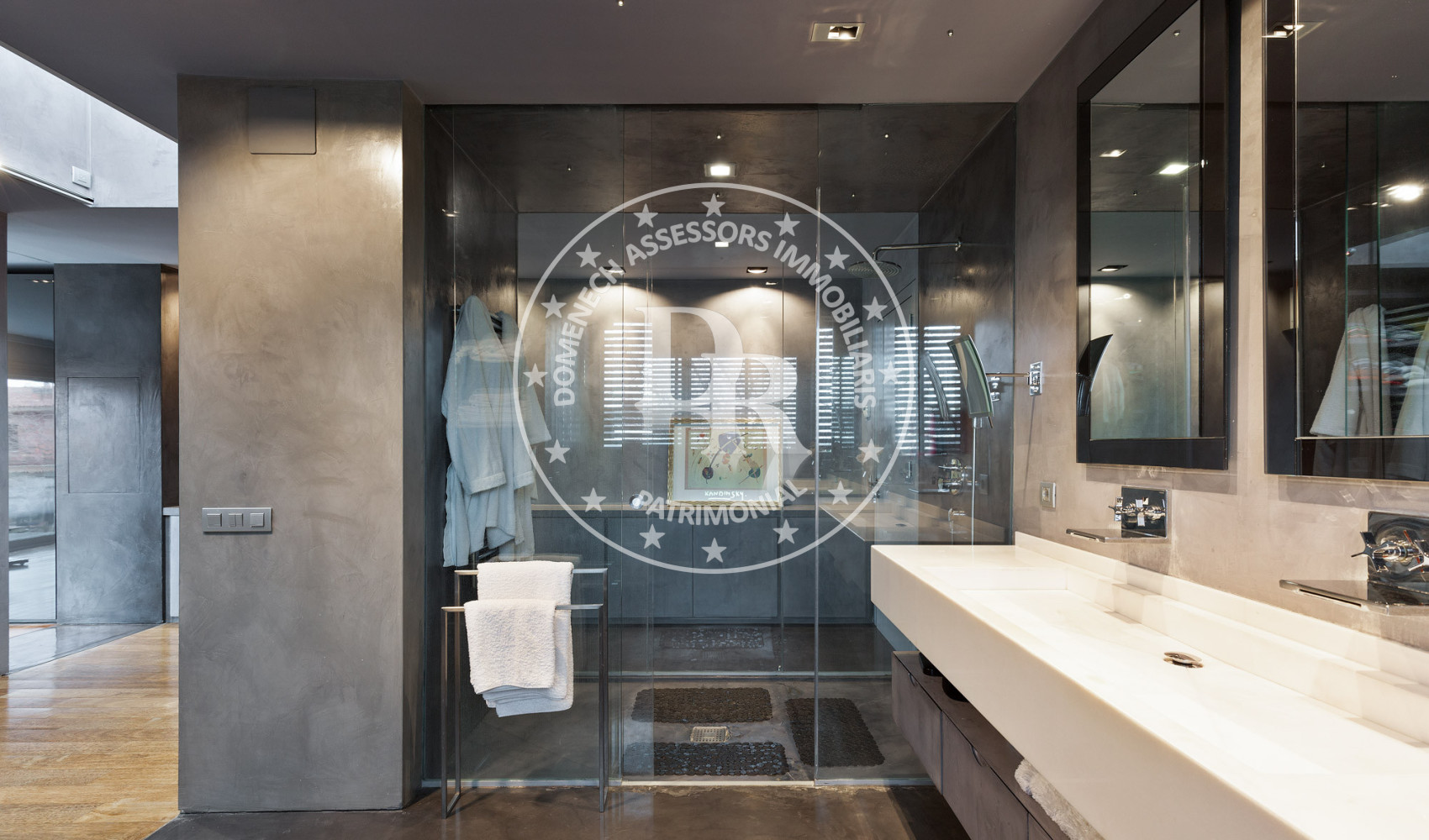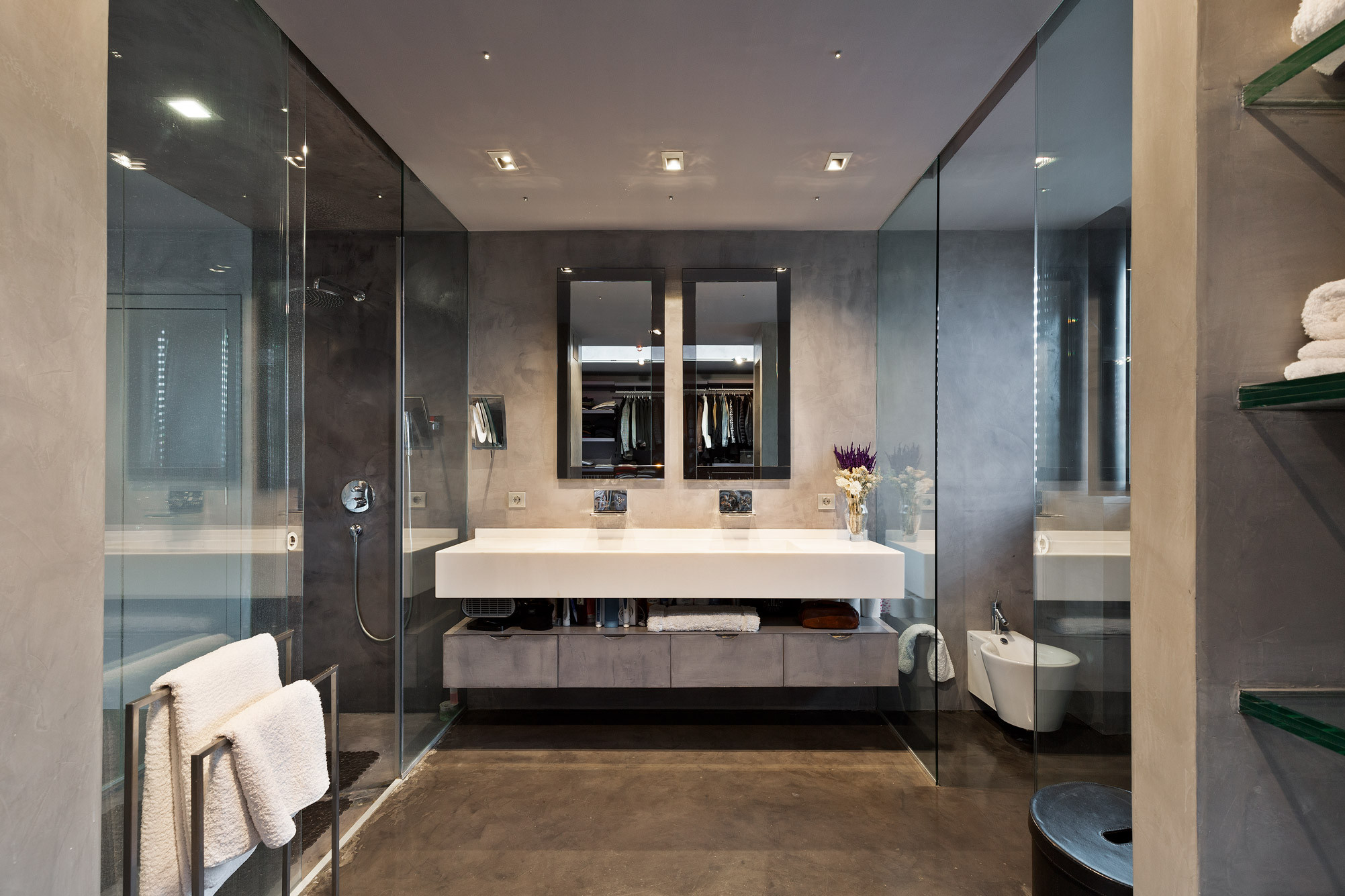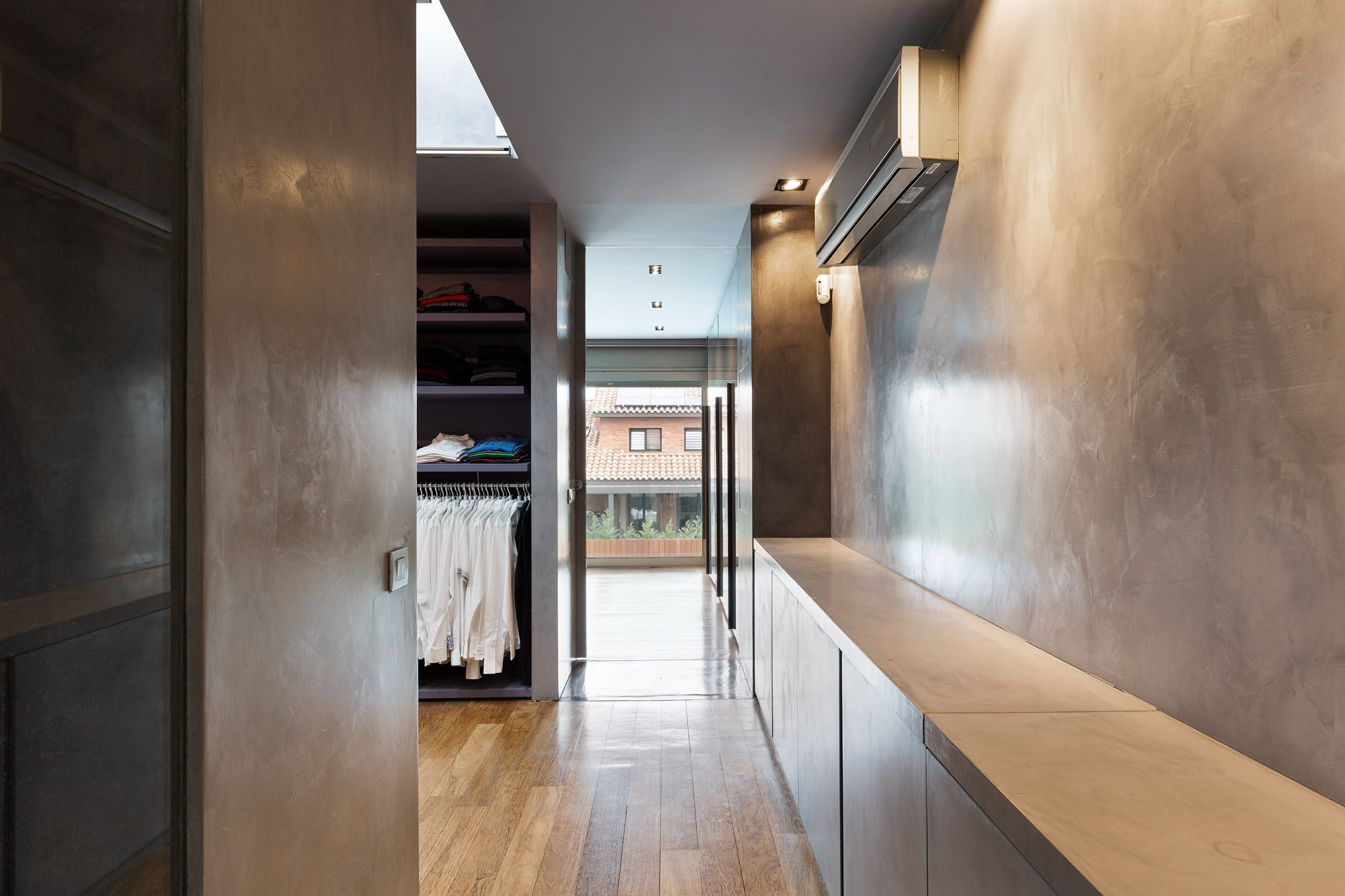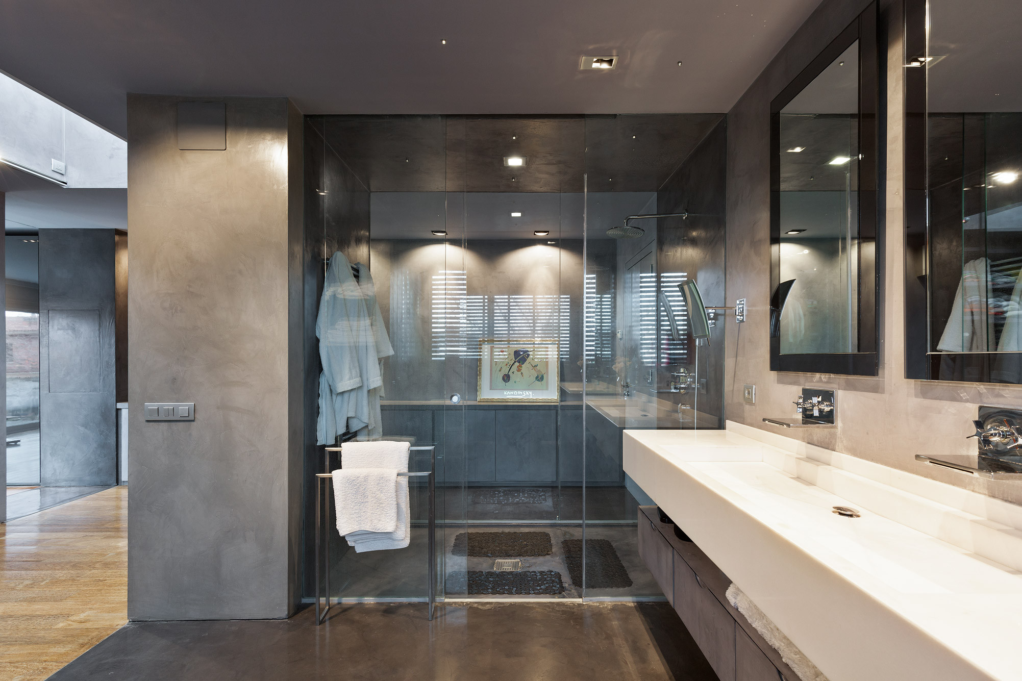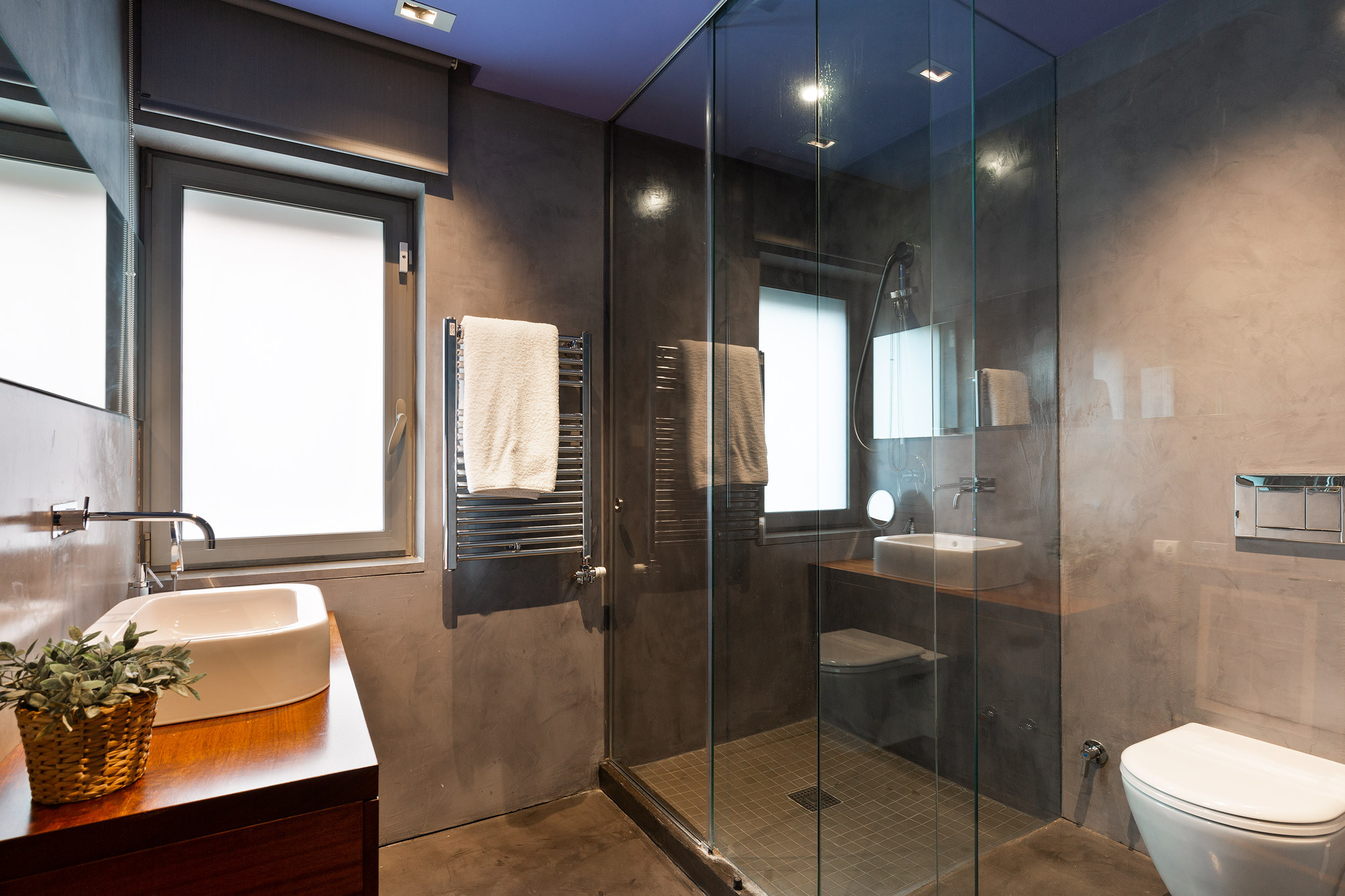 - Suelos de gres, parquet y microcemento gris con calefacción radiante.