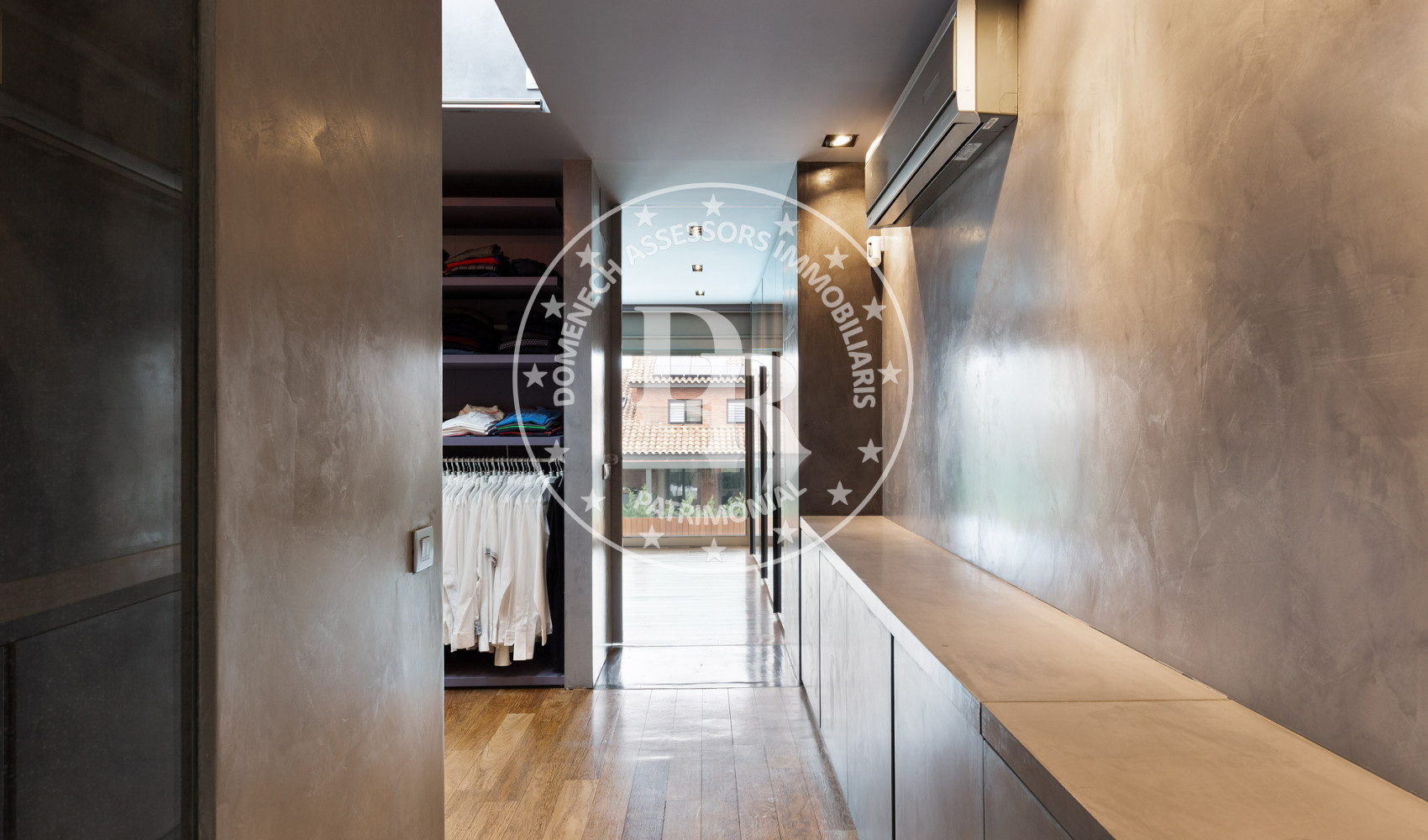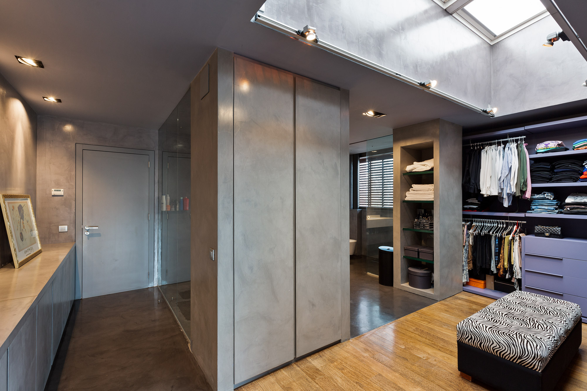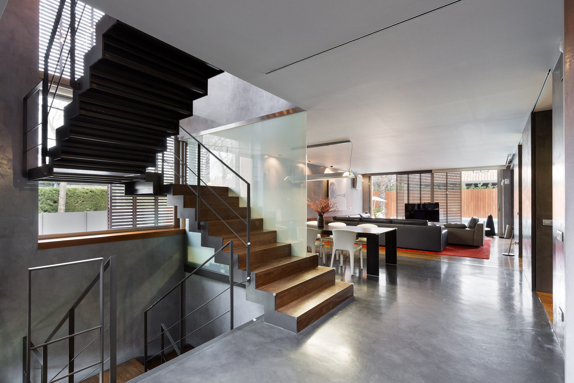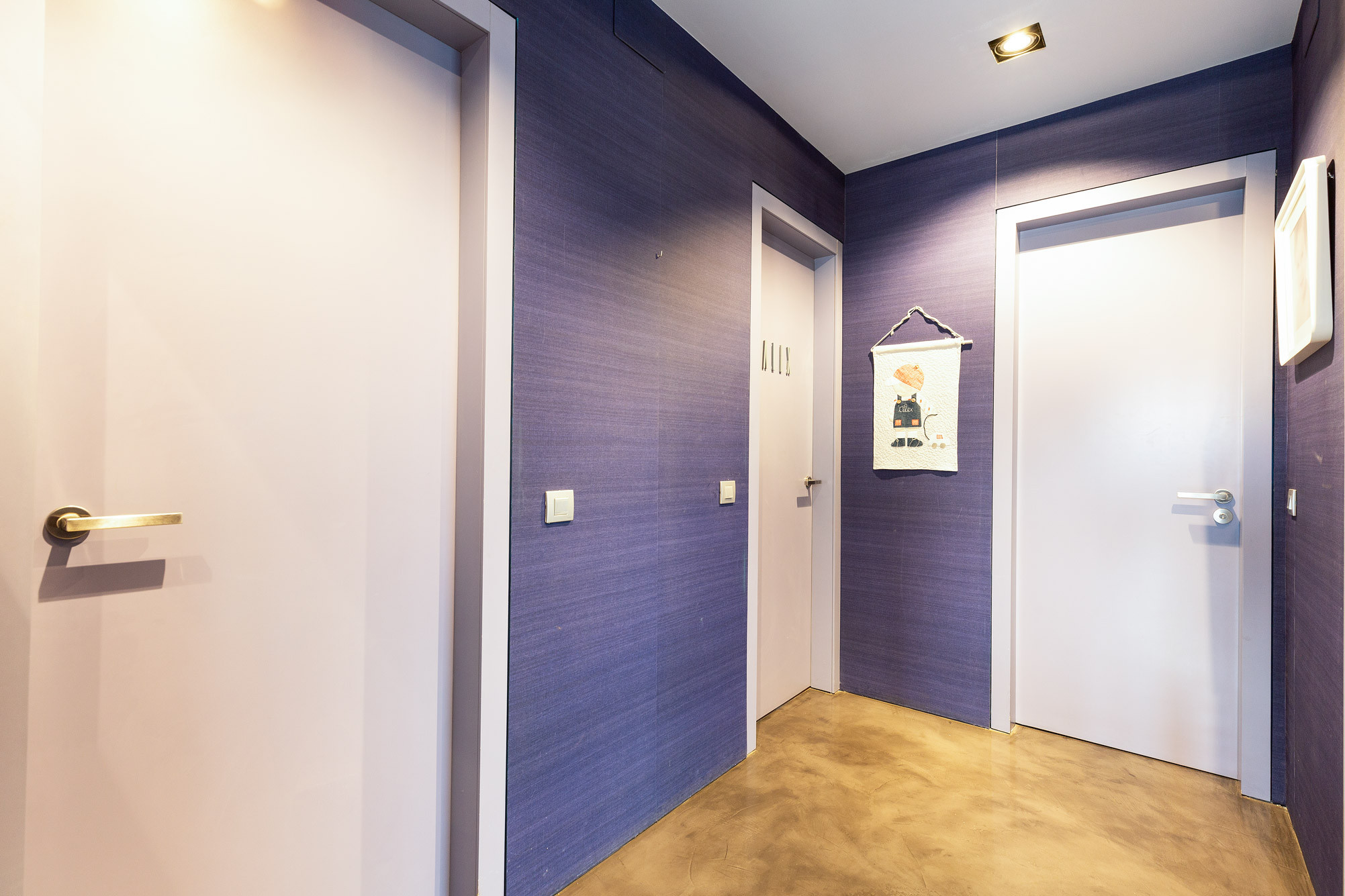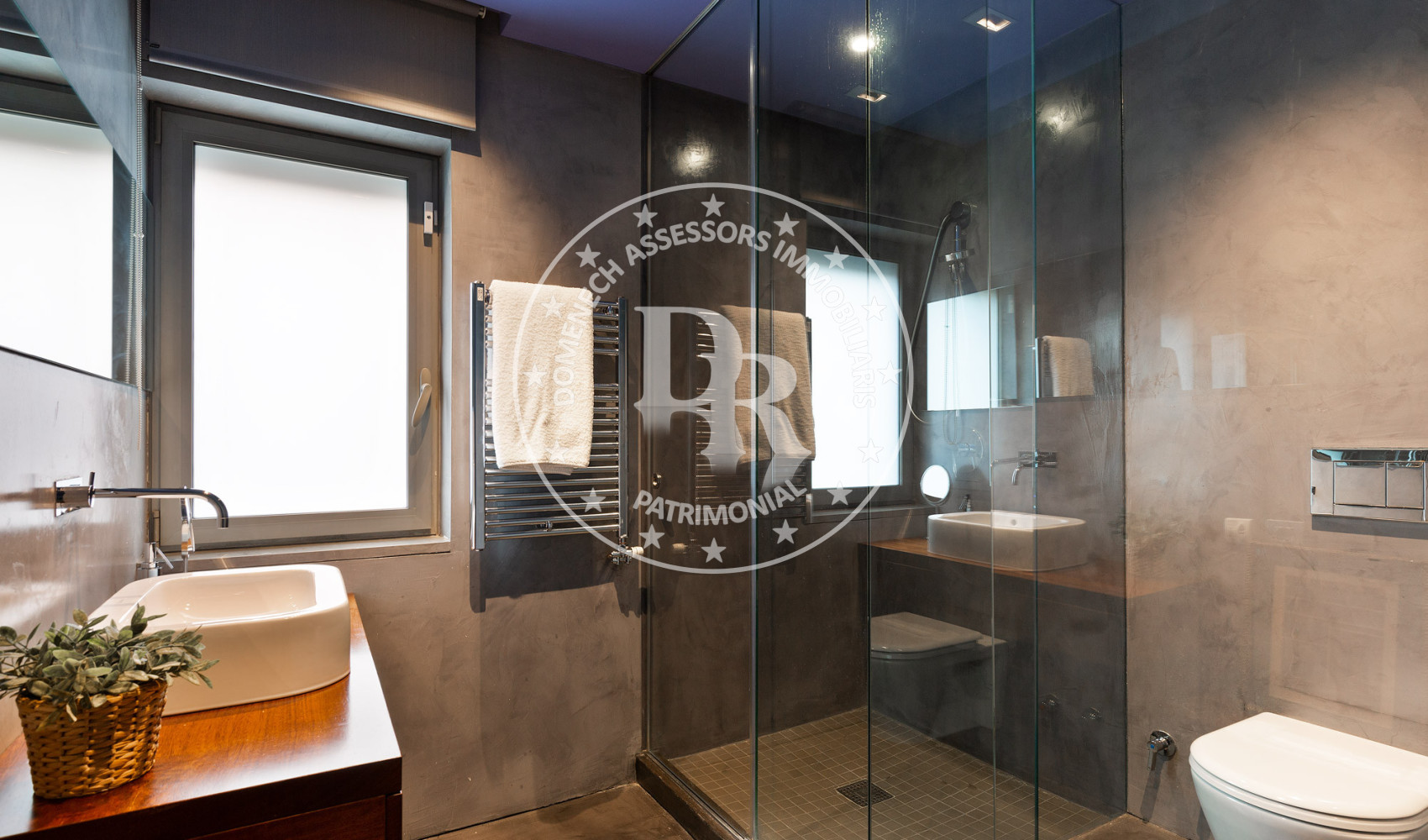 - Suelos de gres, parquet y microcemento gris con calefacción radiante.