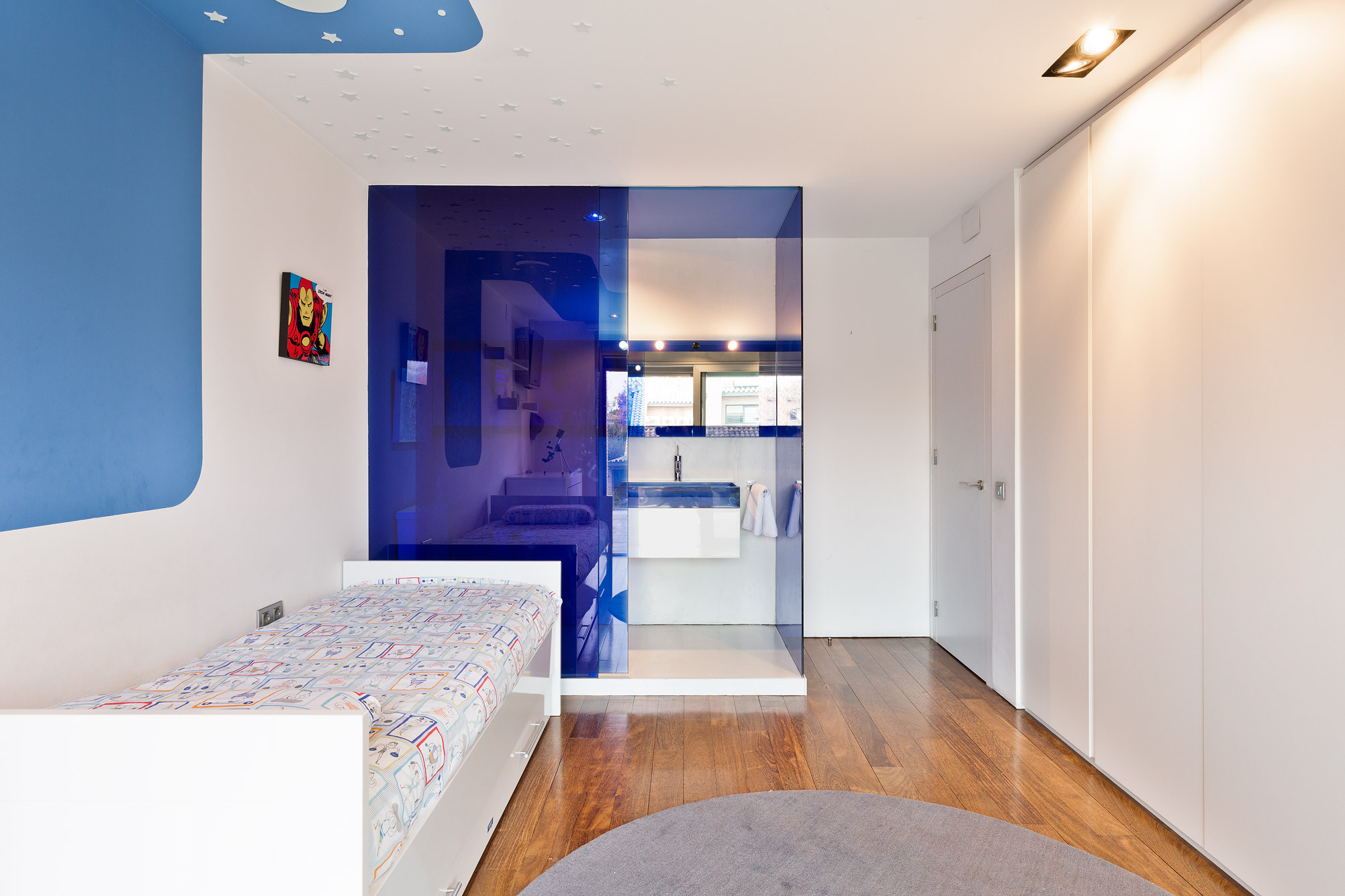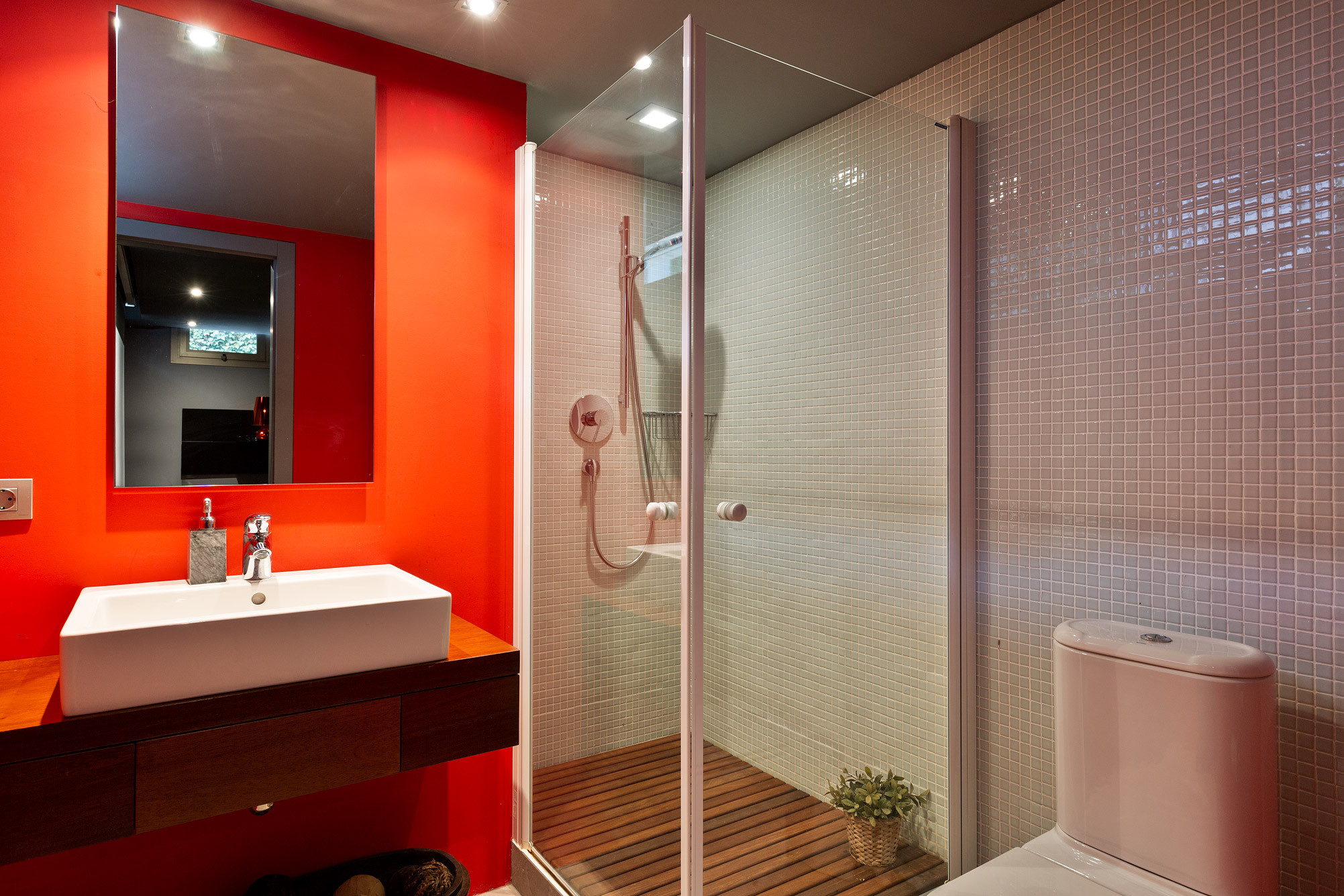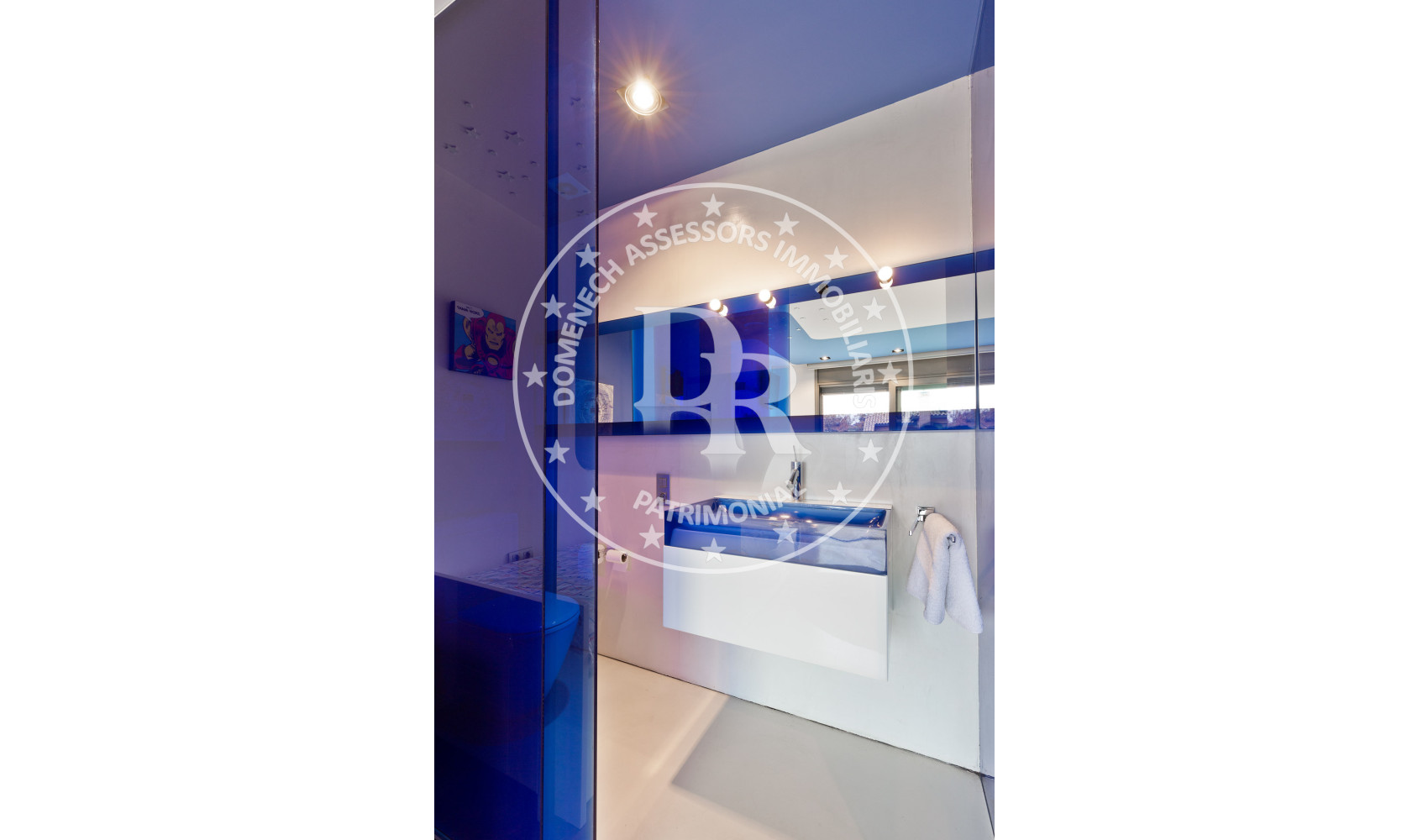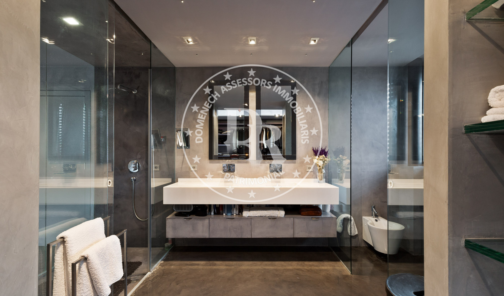 - Baños con grifería de pared Ritmonio, inodoros suspendidos Starck para Duravit y ducha Starck Hansgrohe.