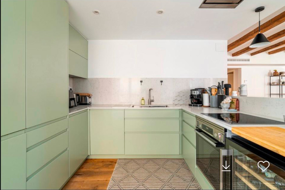 Una cocina abierta estilo americano, totalmente equipada con electrodomésticos integrados y una nevera pequeña para vinos, se convierte en el corazón social del hogar.