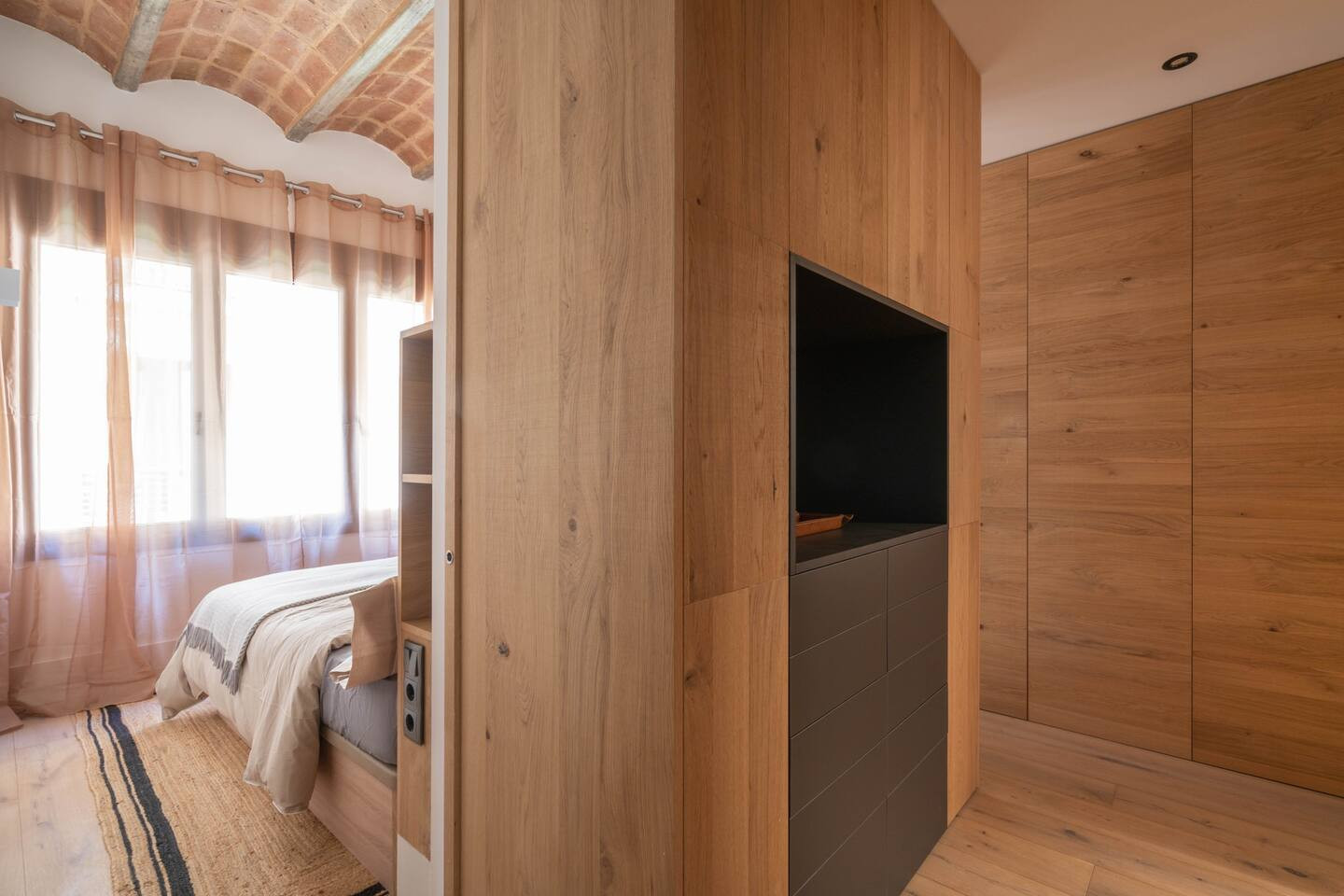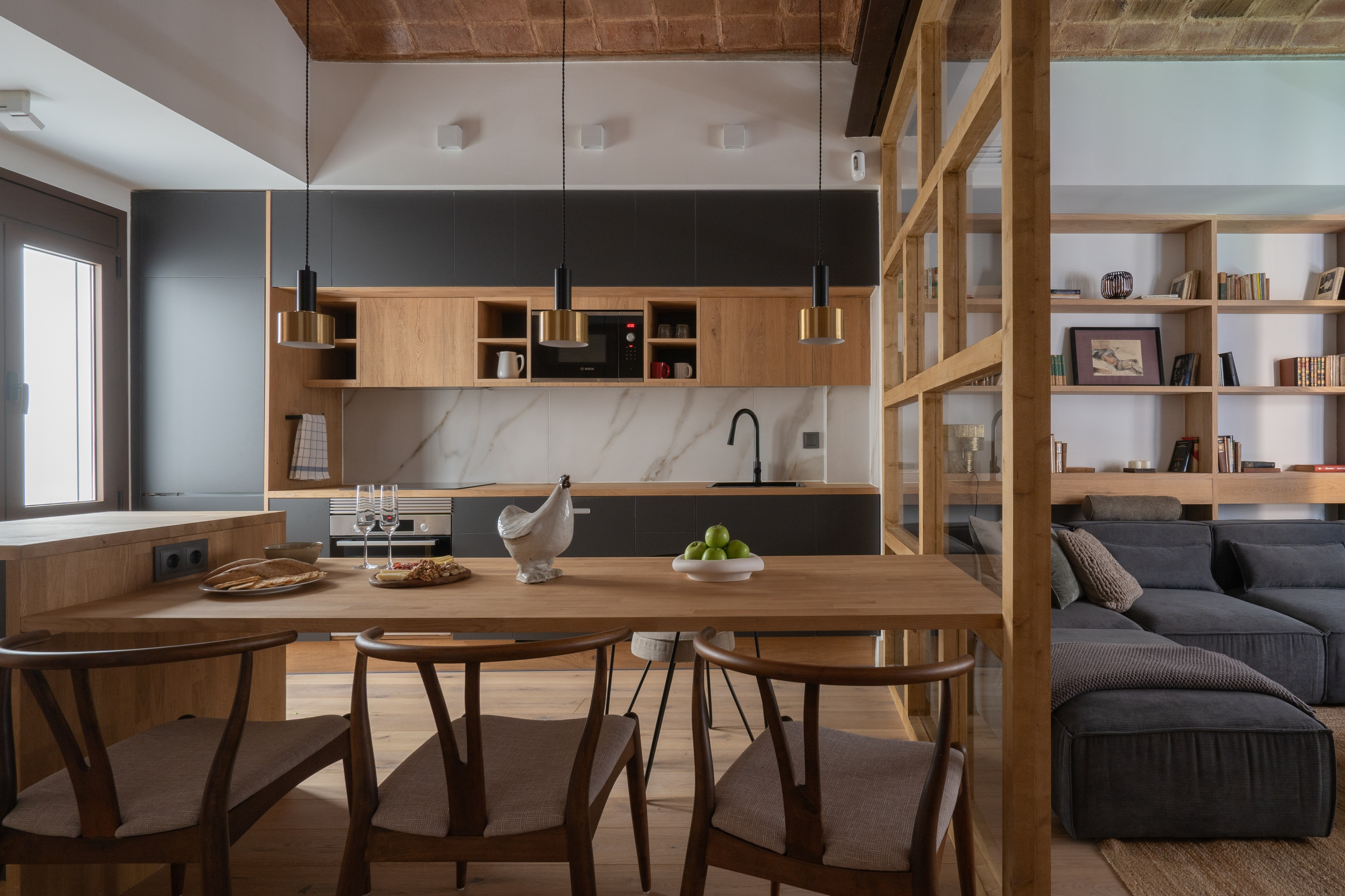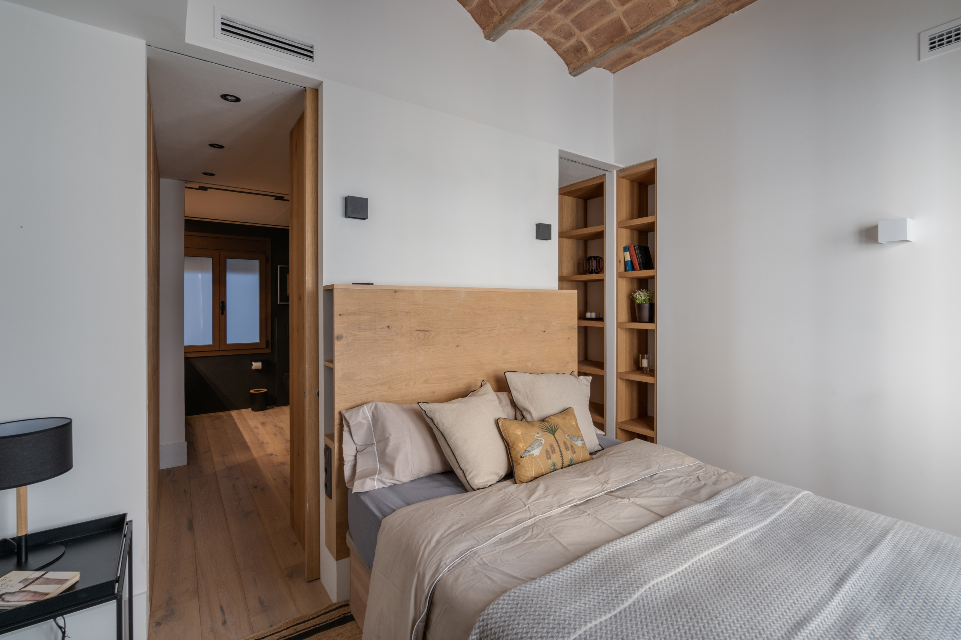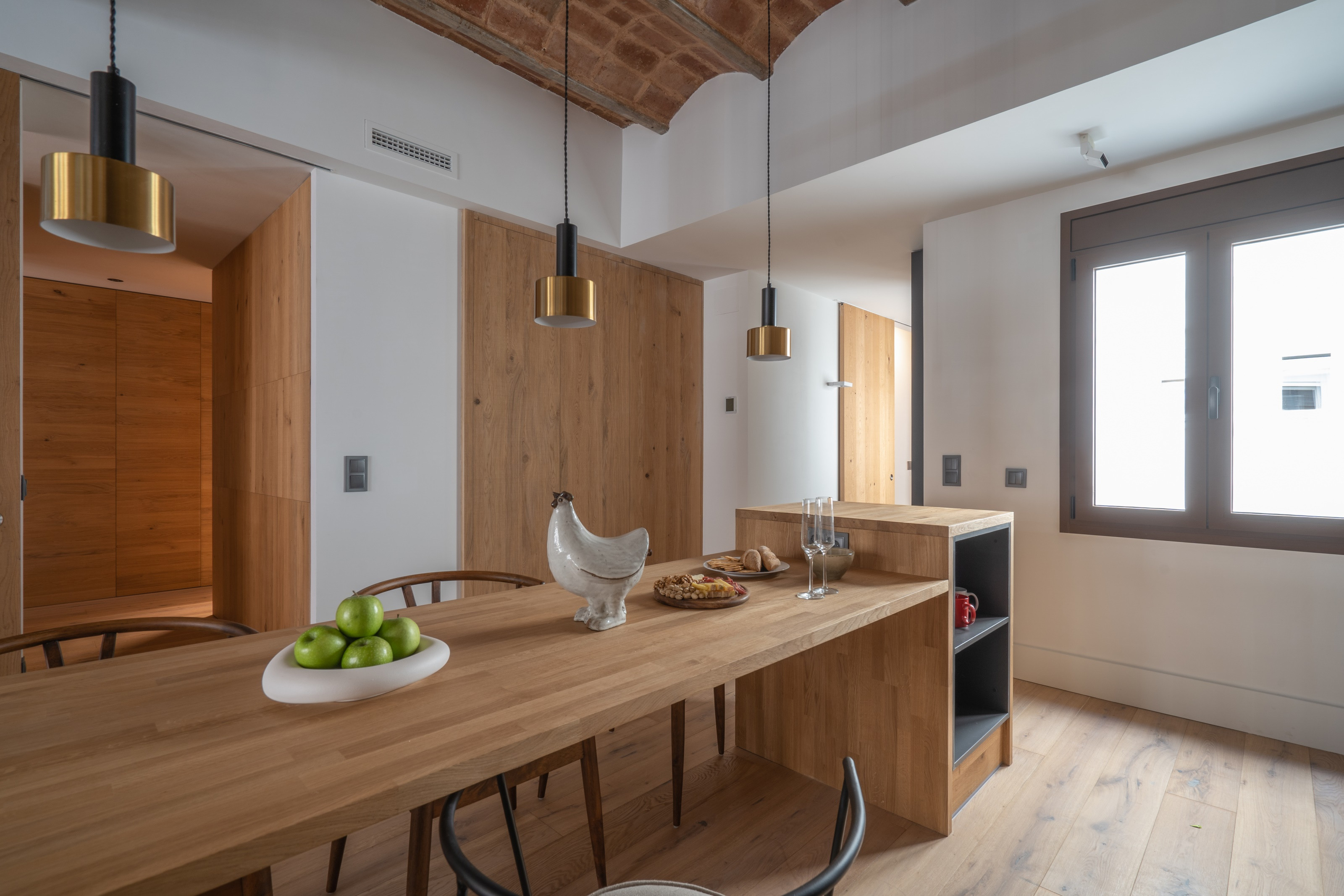 - Decoración: Tonos suaves y acabados de madera que brindan un toque moderno, respetando el encanto de la época con techos abovedados catalanes.